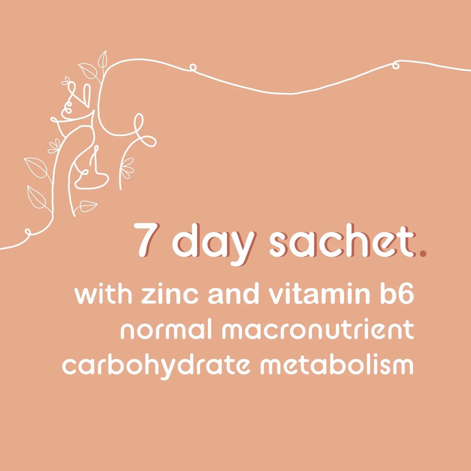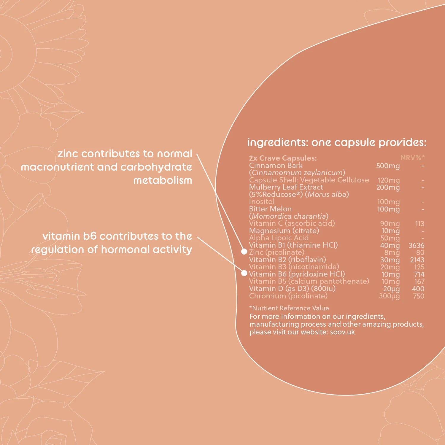 It’s completely normal to crave food, particularly sugar and carbohydrates, in the days before and whilst on your period. There are a variety of reasons this might happen, but the key factors seem to be serotonin production and the fluctuations in hormonal levels of oestrogen and progesterone. So, whilst there is absolutely no judgement here, if you do want to try and lessen those cravings in a less sugar-coated way, we’ve made Crave, a 7-day sachet supplement just for you. Each sachet contains 2 unique capsules designed by experts just for this product, containing natural derivatives such as cinnamon bark, mulberry lead and bitter melon, as well as a host of vitamins and minerals including zinc which contributes to normal macronutrient and carbohydrate metabolism, and B6 which contributes to the regulation of hormonal activity.
